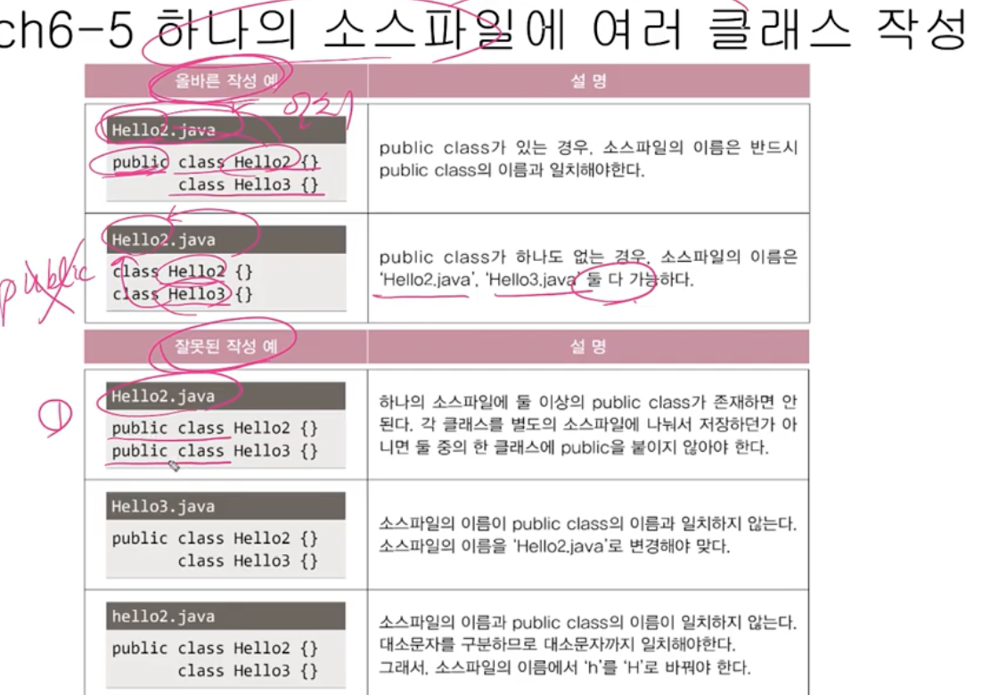public class 가 있는 경우, 소스파일의 이름은 반드시 public class의 이름과 일치해야한다.