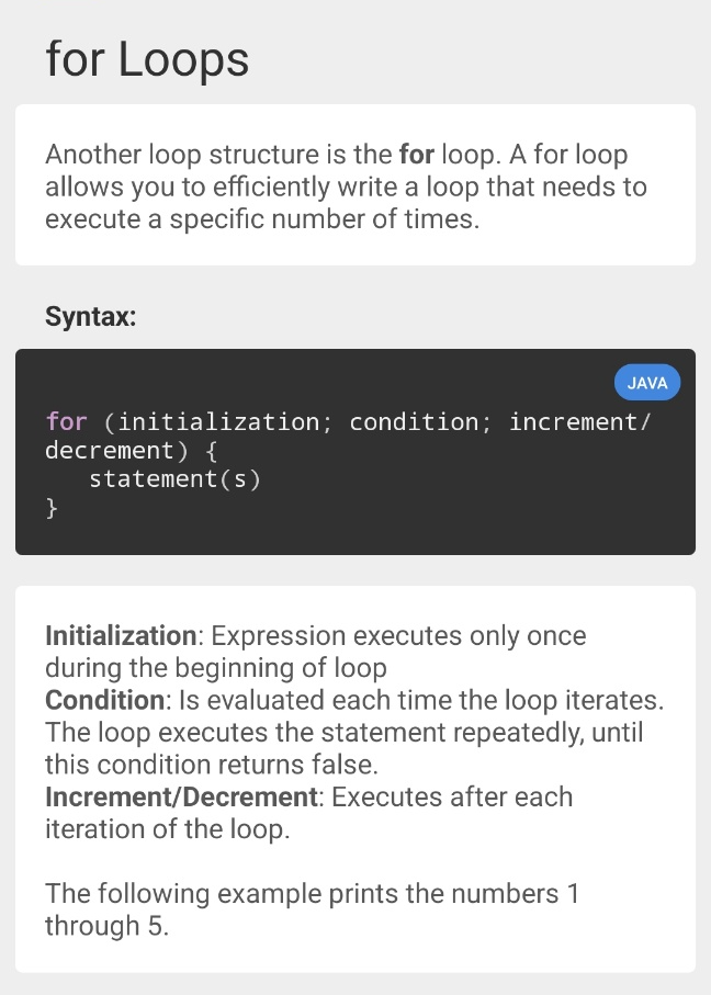 - for(initialization; condition; increment/decrement){statement(s)}