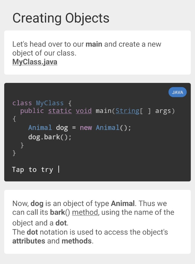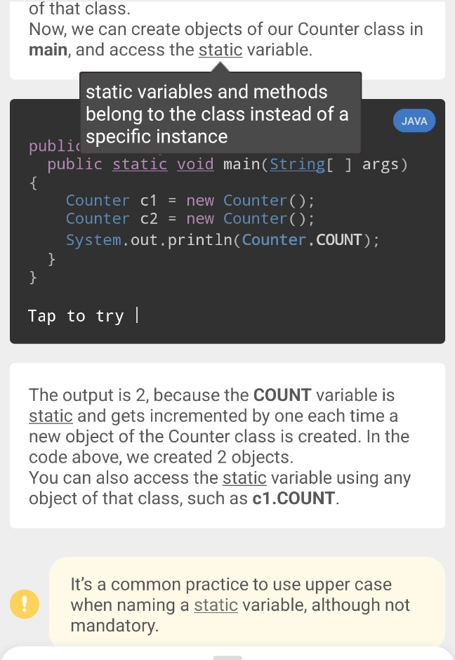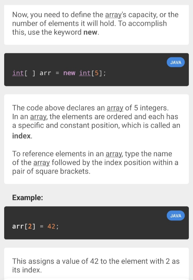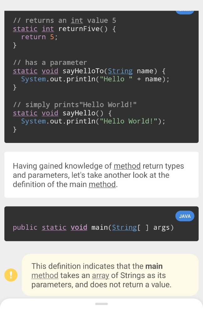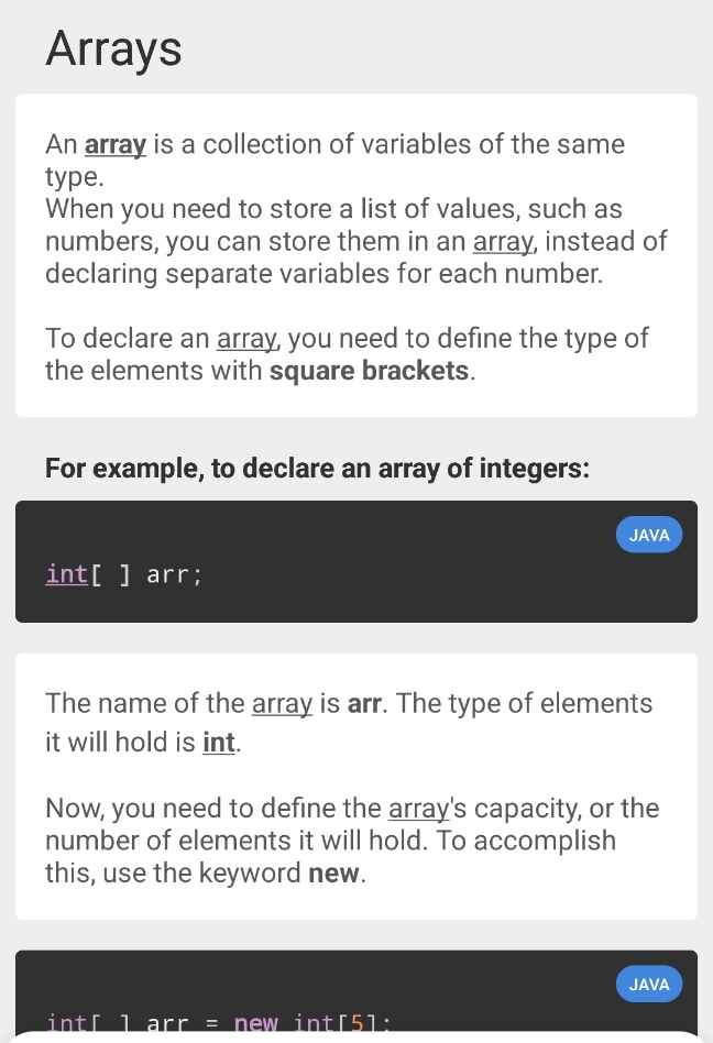 Sololearn에서 제공하는 Java 언어 학습은 총 60개 레슨으로 이루어져 있습니다. 현재는 아직 40번째 레슨에 머물러 있는 상태에요. 뒤로 갈수록 어려워져서 그렇습니다. 부트캠프 핑계로 Sololearn을 놓고 있지만 이번주 일요일까지는 Sololearn의 Java를 끝내 보도록 하겠습니다. 어차피 저랑은 당분간 친해지려고 노력해야하는 언어입니다. 이 포스팅에서는 공부하다가 헷갈리거나 다시 복습하고 싶은 부분을 캡쳐해서 정리해보려고 합니다.