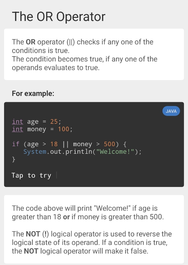 - The OR Operator(||)은 어느 하나가 true이면 실행