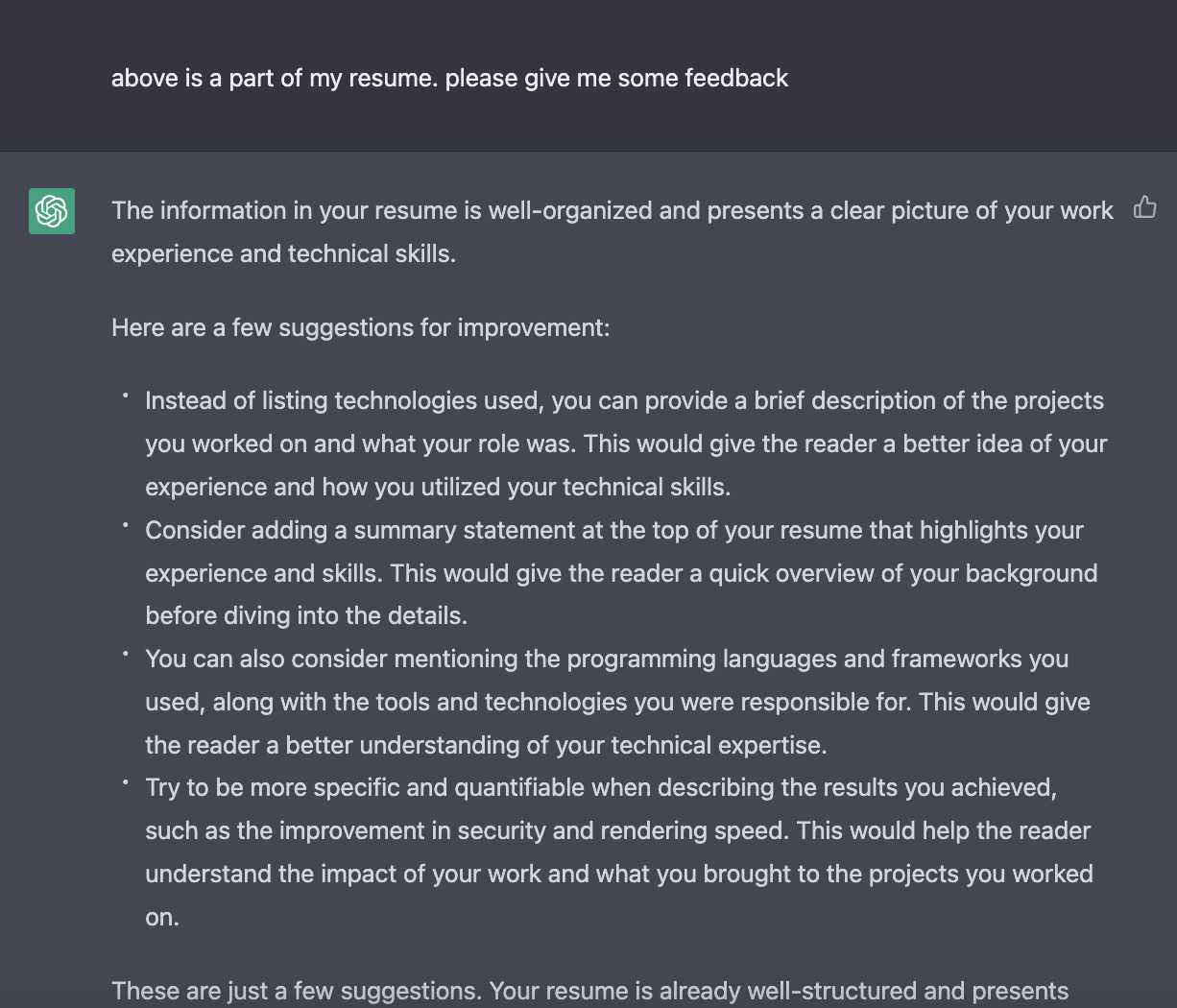 개발자 이력서는 처음이라 어떤 포맷으로 해야할지도 고민이 됩니다. 최종 프로젝트가 커서 할 말이 많아 다행입니다. 내일까지 이력서 제출하고 피드백을 받는 일정입니다. 취업까지 화이팅!